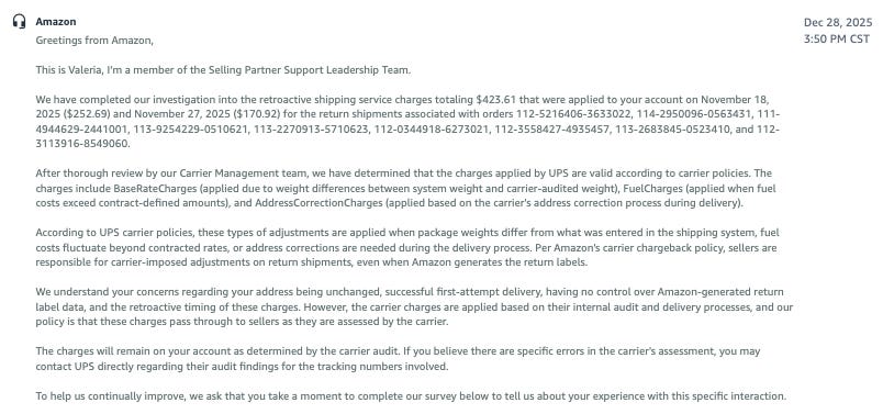 After repeated attempts to obtain clarity through Amazon’s seller support channels, one Chicago-based seller escalated the issue directly to UPS — and uncovered a practice that raises serious questions about transparency, accountability, and cost-shifting inside Amazon’s third-party marketplace.