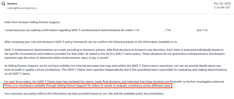 “There is no mechanism available through Selling Partner Support for sellers to review or evaluate consistency across different cases.”