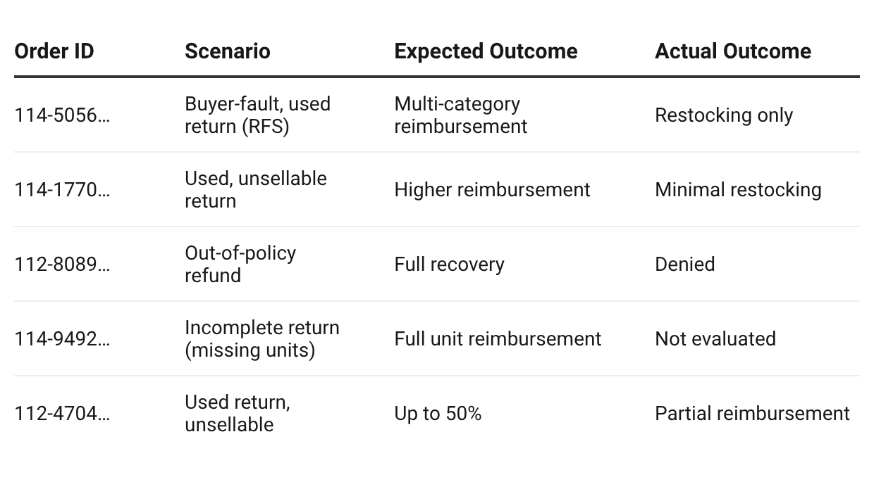 Across multiple recent orders involving buyer-fault returns, used merchandise, and out-of-policy refunds, reimbursement outcomes varied dramatically—even where the underlying facts were materially similar.