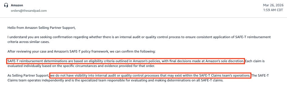 Even Amazon’s own support teams confirm they cannot intervene in SAFE-T outcomes: