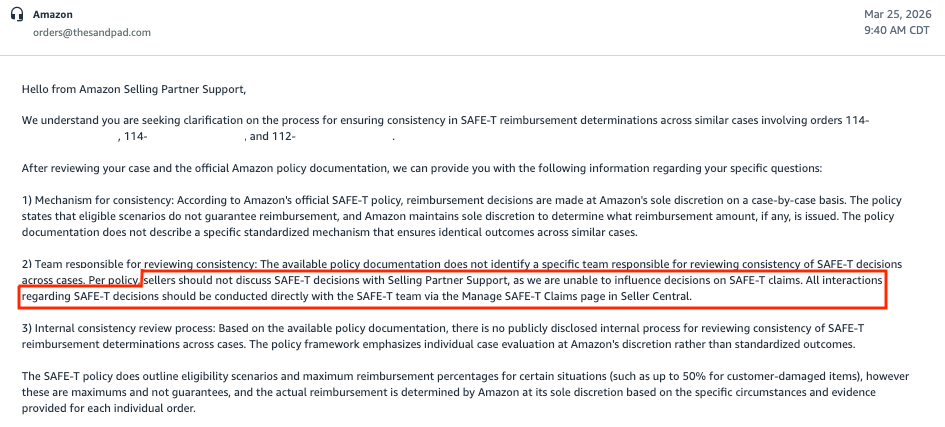 When sellers attempted to clarify how these outcomes were determined, Amazon’s support responses revealed a deeper issue—not just inconsistency, but opacity.