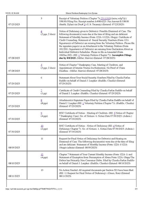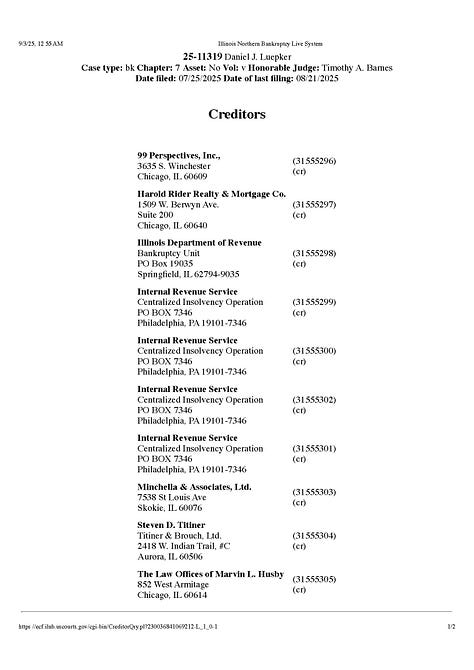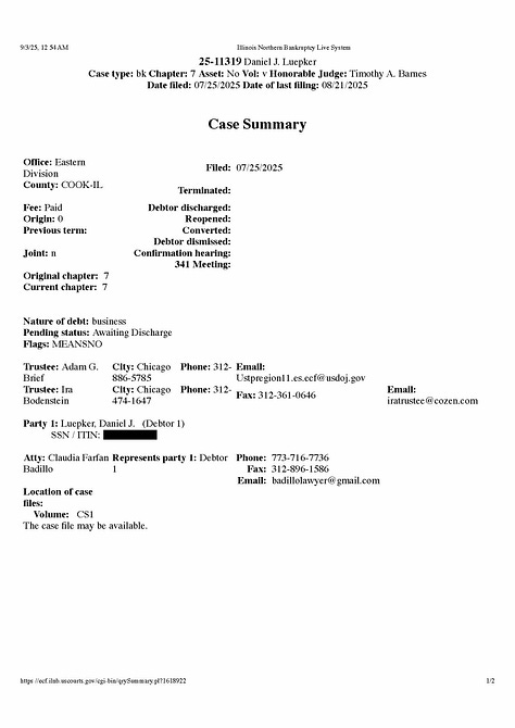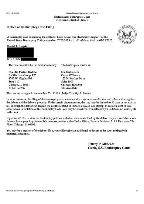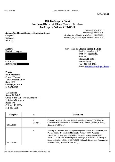 Filed in the U.S. Bankruptcy Court, Northern District of Illinois (Case No. 25-11319, Judge Timothy A. Barnes), Luepker’s July 2025 petition details the full scope of financial ruin: