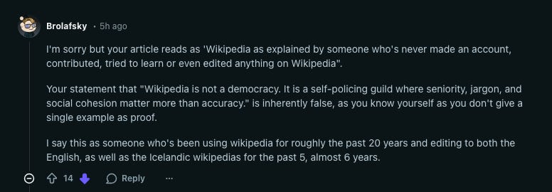 “I’m sorry but your article reads as ‘Wikipedia as explained by someone who’s never made an account, contributed, tried to learn or even edited anything…’ ”