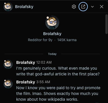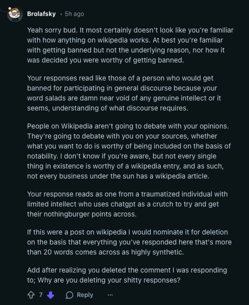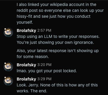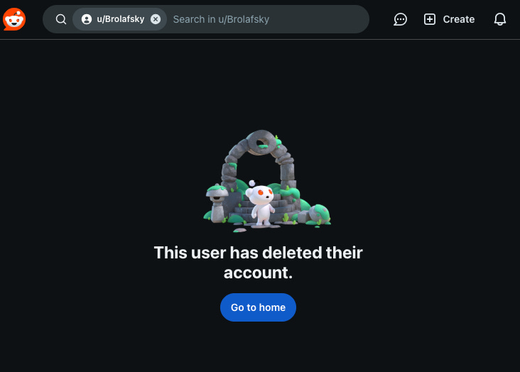 One of the most aggressive Wikipedia defenders — the Reddit user u/Brolafsky, who had been spamming hostile replies, stalking my post history, and sending repeated harassing DMs — has now been silently removed from the platform.
