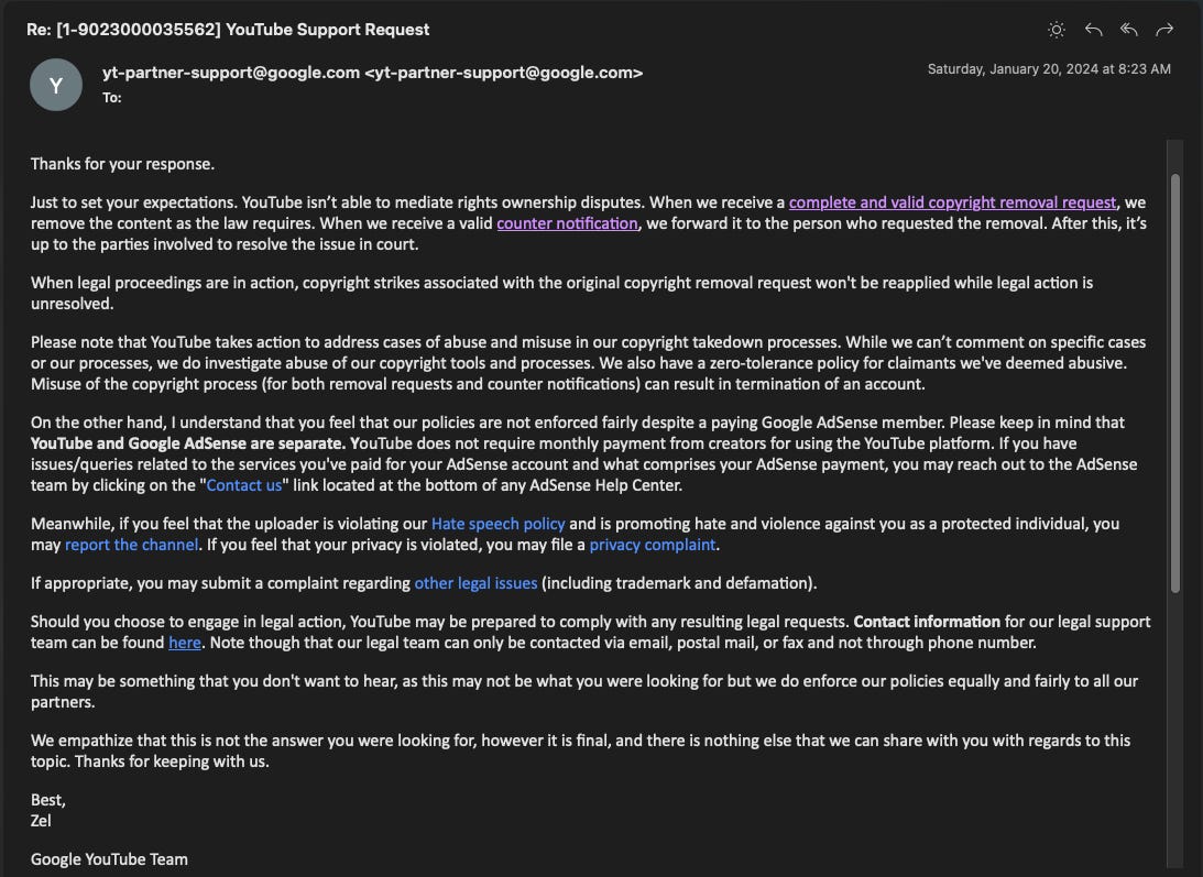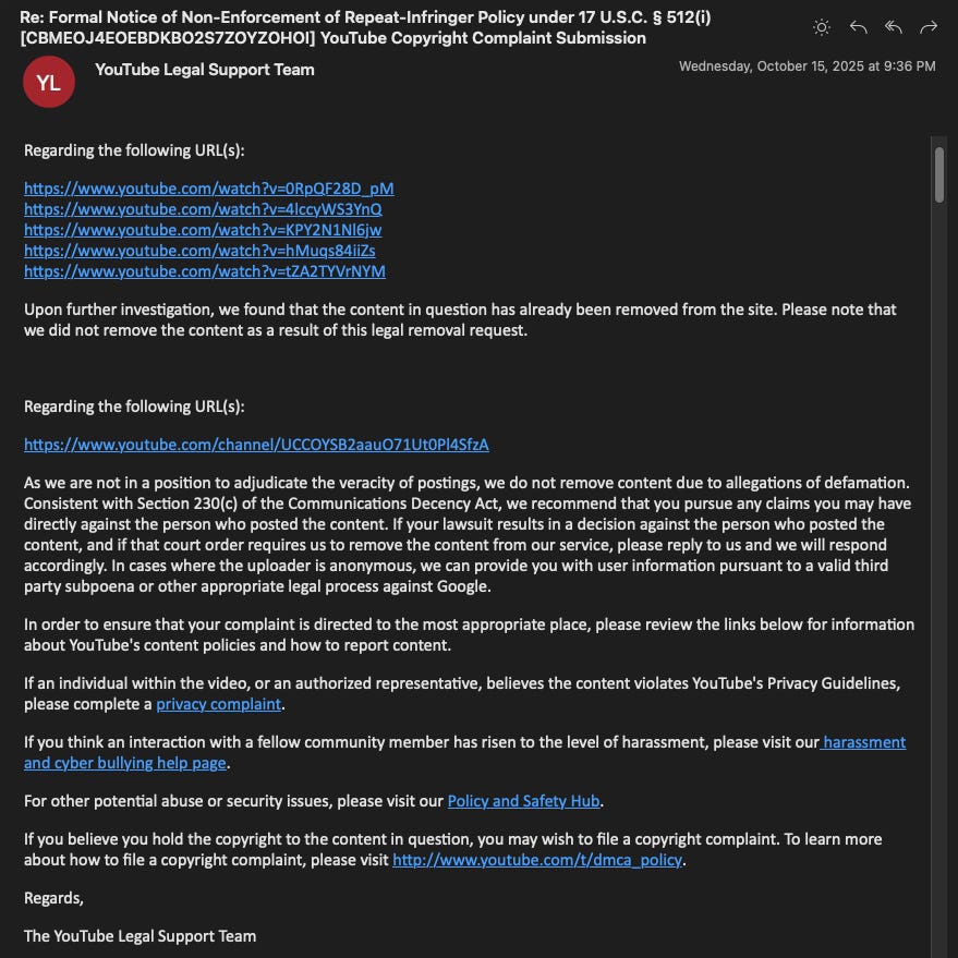 YouTube doesn’t actually apply it to abusers, doxxers, serial harassers, coordinated smear campaign channels, or repeat copyright infringers.